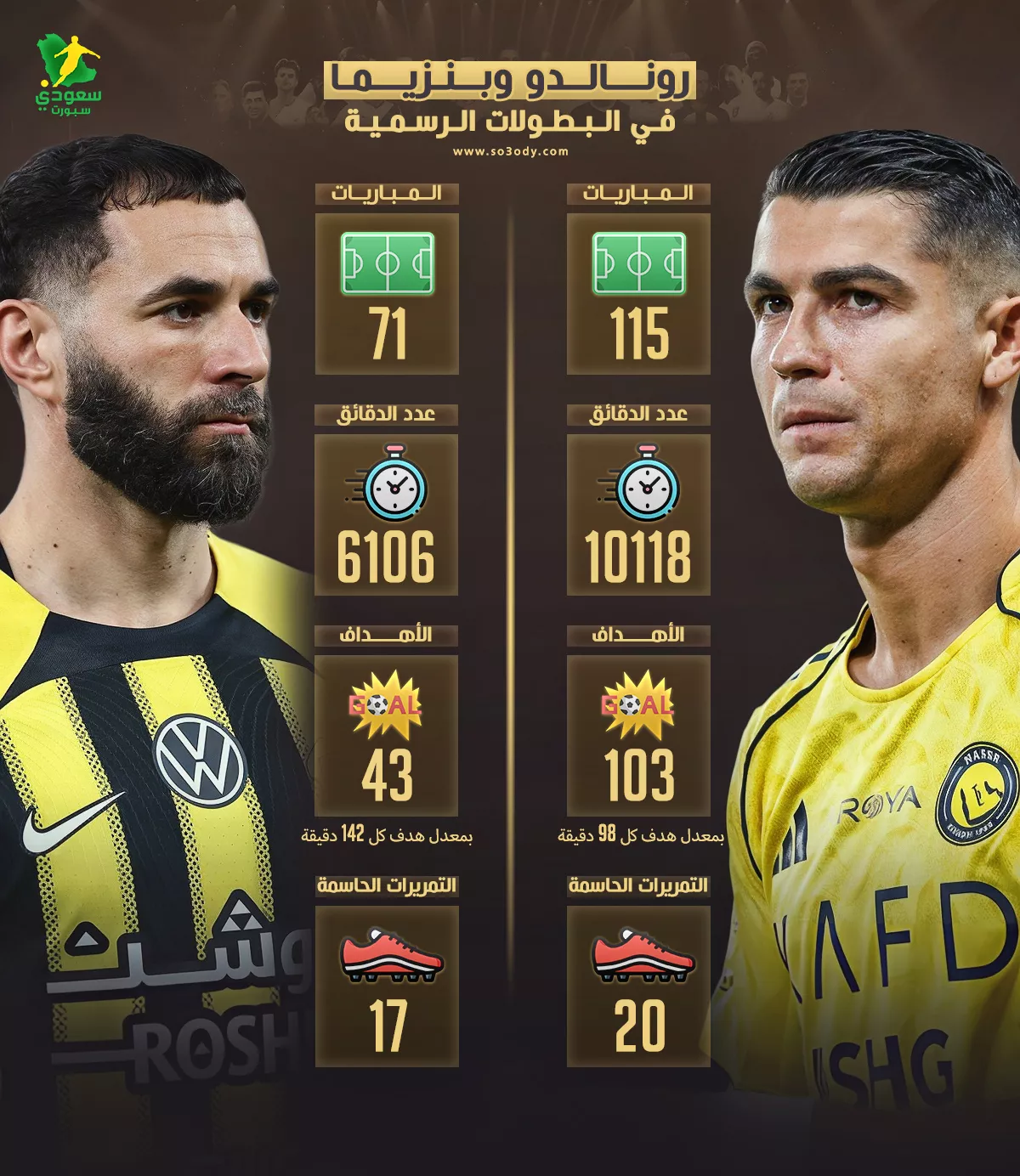 يظل الجدل مستمراً حول المقارنة بين النجمين كريستيانو رونالدو لاعب النصر، والفرنسي كريم بنزيما مهاجم الاتحاد، فما بين من يرجح أفضلية البرتغالي و بين من يدعم تأثير الكريم الفرنسي ، تظل الأرقام أحد أهم الطرق التي تقيس التأثير.