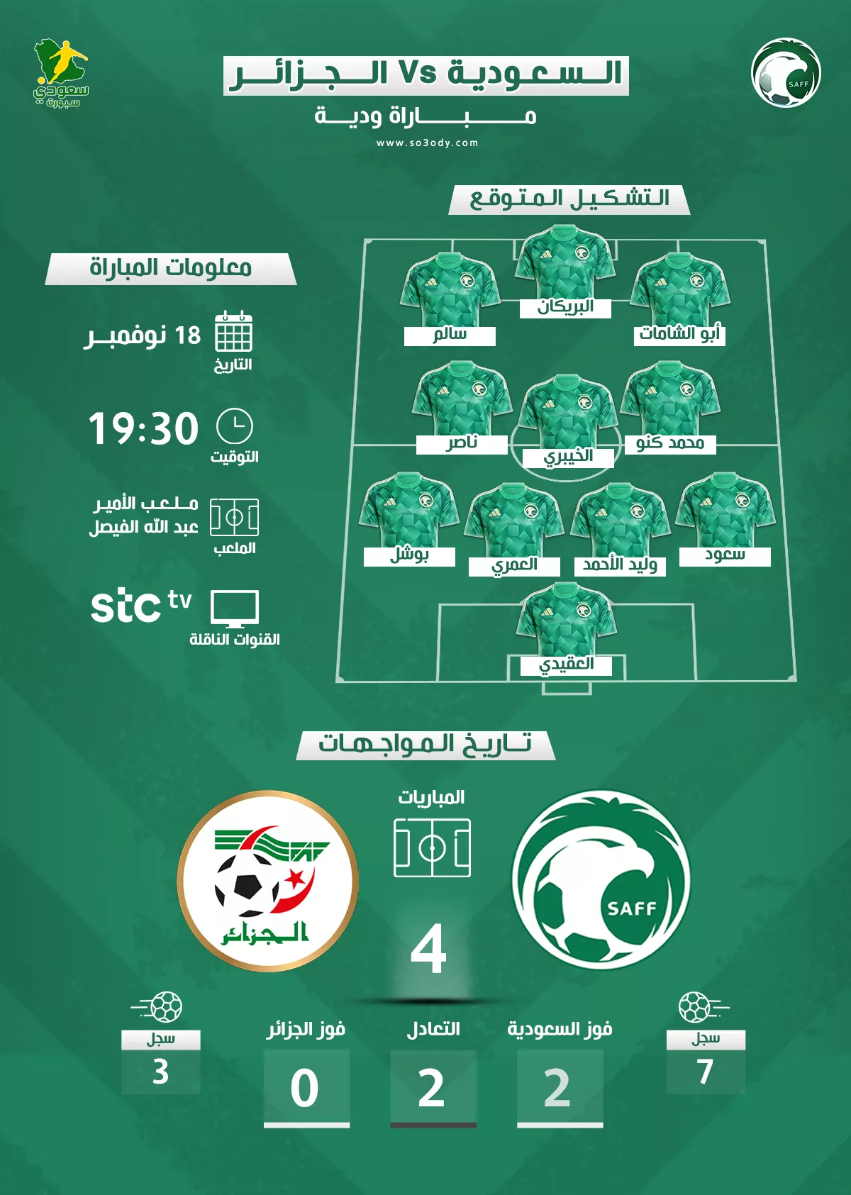 موعد وقناة بث مباراة السعودية والجزائر والتشكيل المتوقع