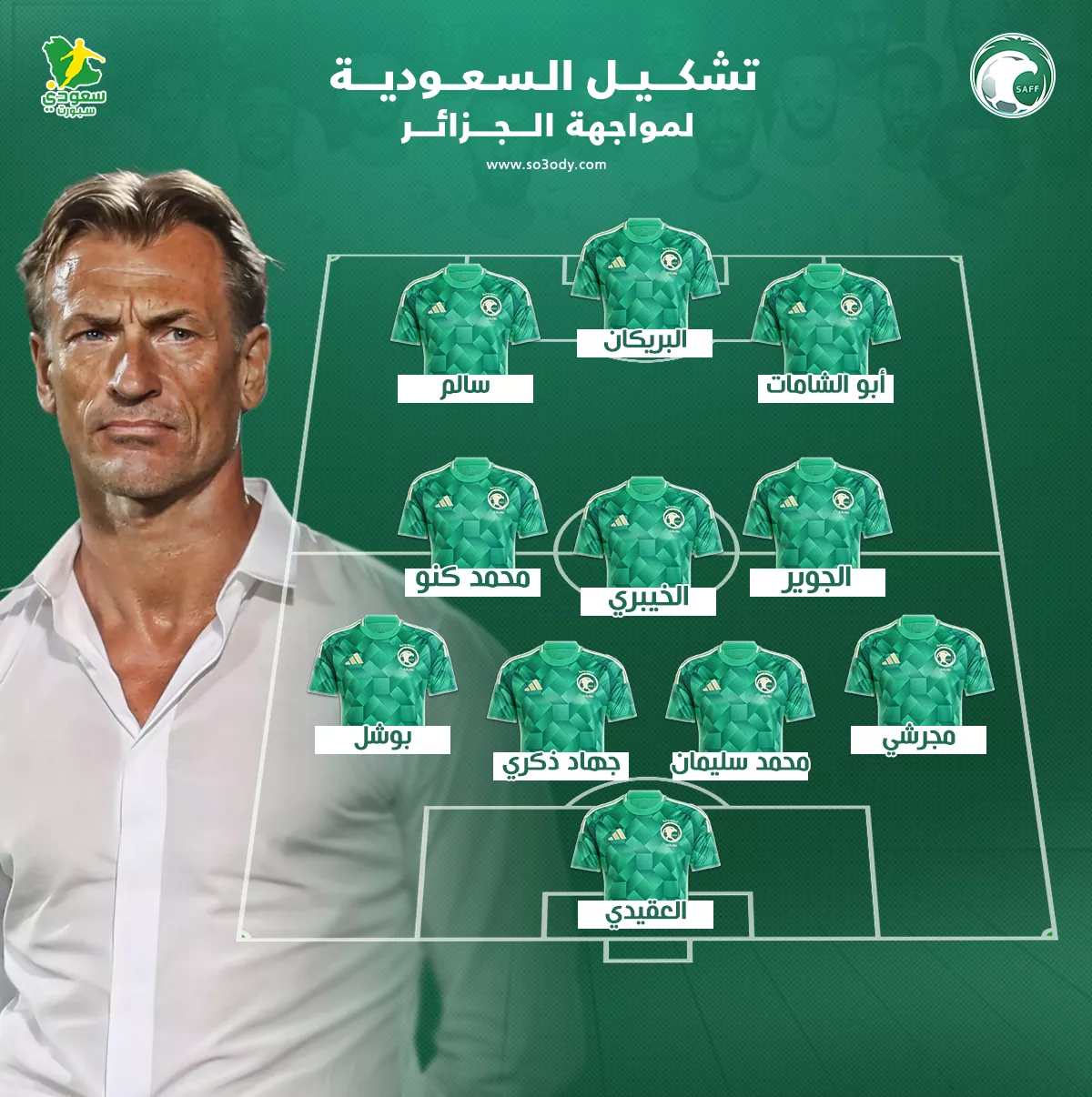 يستعد المنتخب السعودي لمواجهة قوية اليوم أمام المنتخب الجزائري في إطار استعداداتهما لبطولة كأس العرب التي ستقام في قطر نهاية العام الجاري. وقد أعلن المدير الفني الفرنسي للمنتخب السعودي هيرفي رينارد تشكيلة الأخضر الرسمية قبل هذه المباراة الهامة.