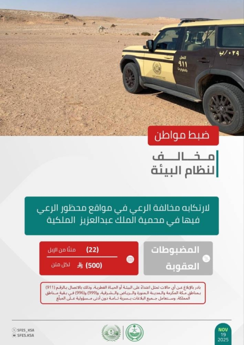 وفي هذا السياق، أكدت القوات أن عقوبة رعي الإبل تشمل غرامة مالية قدرها (500) ريال لكل متن. وناشدت الجهات المختصة المواطنين بالإبلاغ عن أي حالات تعتبر اعتداءً على البيئة أو الحياة الفطرية، وذلك عبر الاتصال بالأرقام المخصصة للإبلاغ في مناطق مكة المكرمة والمدينة المنورة والرياض والشرقية، أو في بقية مناطق المملكة.