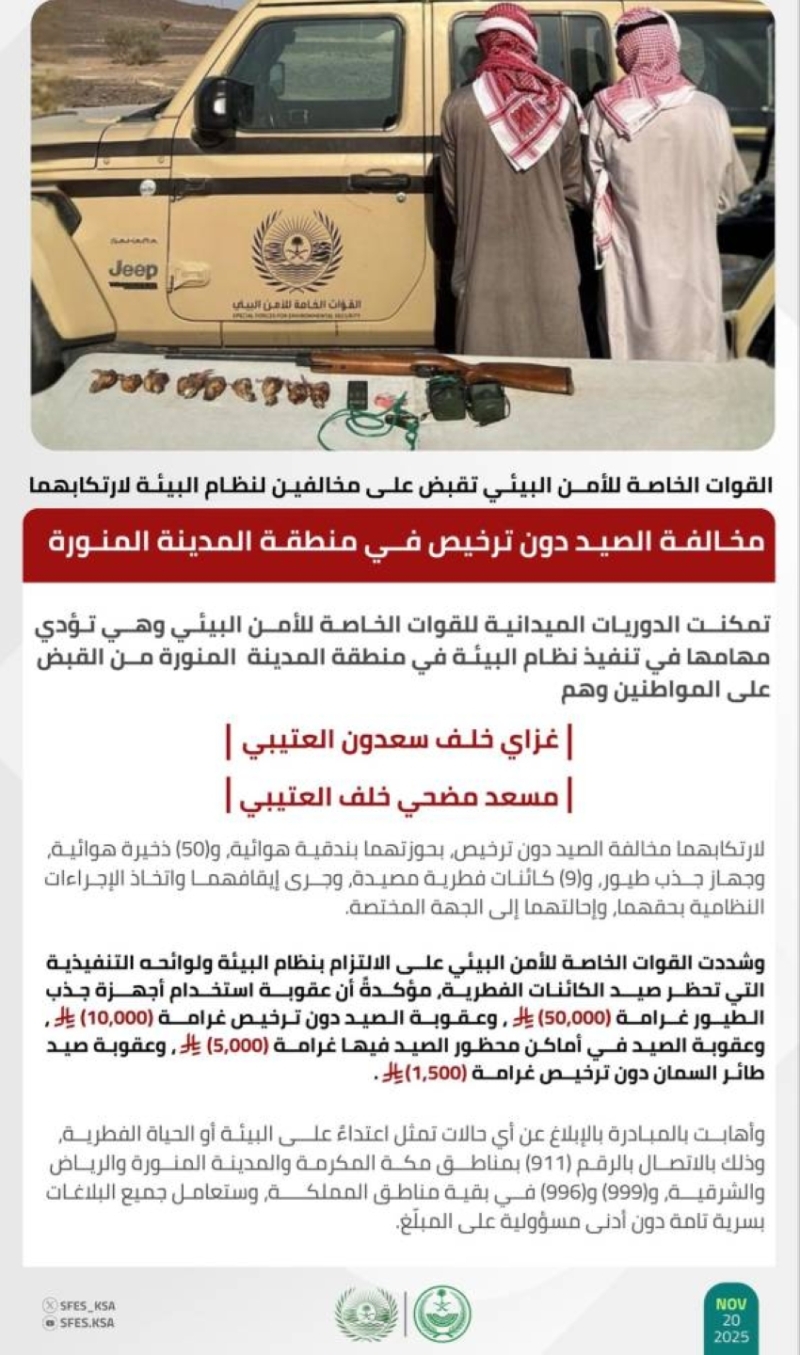 تم القبض على مواطنين في المدينة المنورة بتهمة الصيد غير المشروع