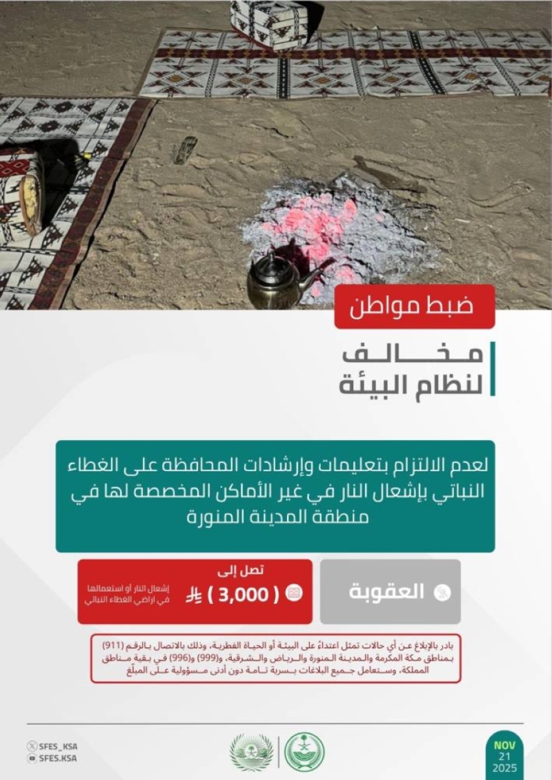 عقوبة إشعال النار في الغابات والمتنزهات الوطنية تصل إلى غرامة قدرها 3,000 ريال. ودعت القوات الجميع للإبلاغ عن أي حالات تعتبر اعتداءً على البيئة أو الحياة الفطرية عبر الأرقام المخصصة للإبلاغ في مناطق مختلفة من المملكة.