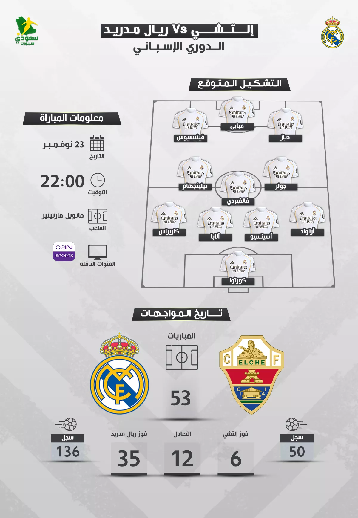 في مواجهة مثيرة غدًا الأحد، يستعد فريق ريال مدريد لمواجهة إلتشي في إطار الجولة الـ13 من الدوري الإسباني “الليجا”.