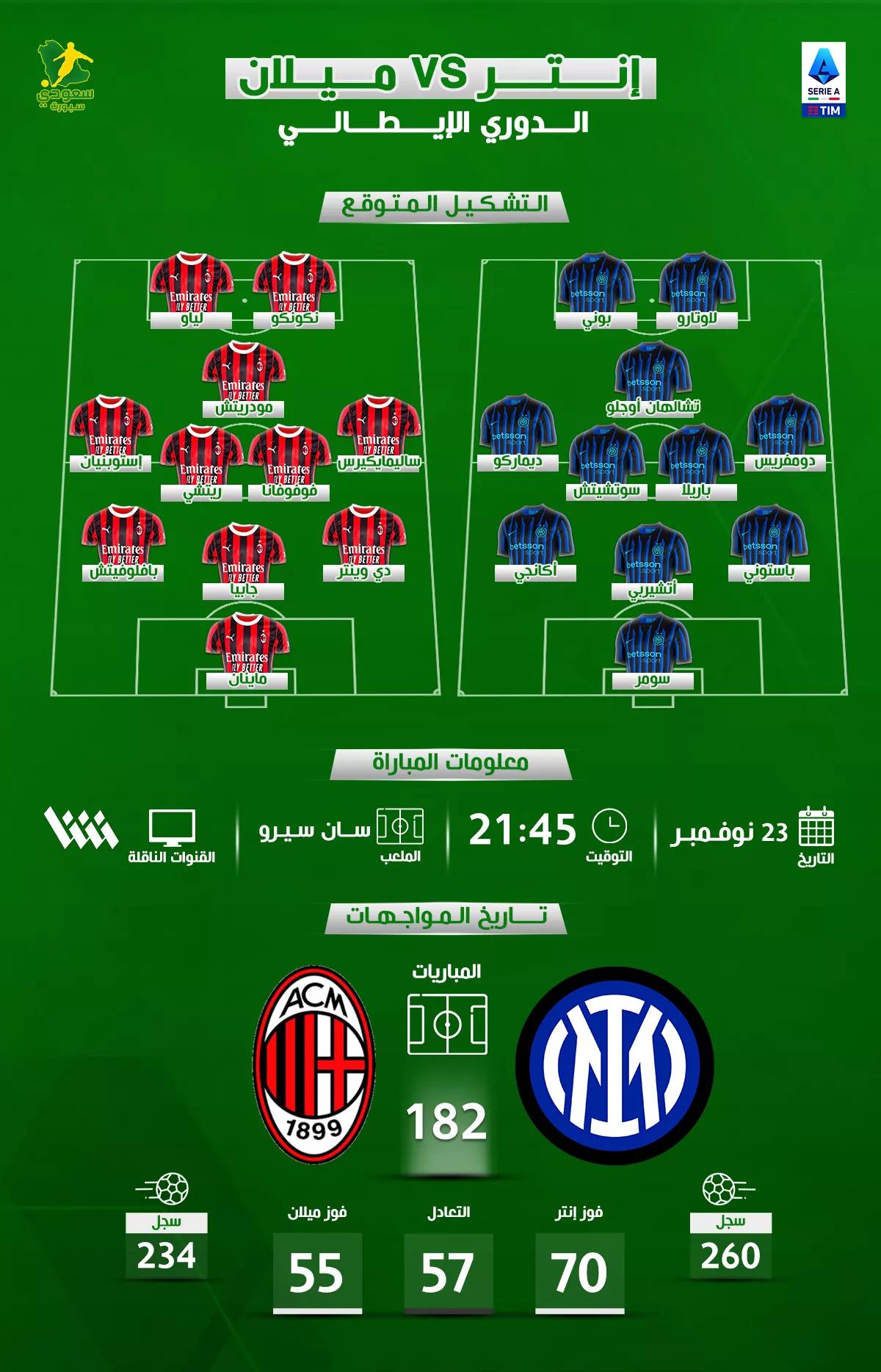 ستنطلق المباراة بين إنتر ميلان وميلان في تمام العاشرة إلا ربع مساءً، وتذاع تلفزيونيًا عبر منصة شاشة.