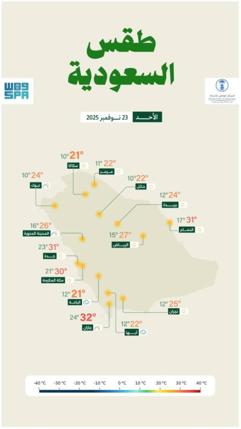 توقع المركز الوطني للأرصاد، في تقريره اليوم، استمرار تأثير الرياح النشطة المثيرة للأتربة والغبار على عدة مناطق في المملكة العربية السعودية. ومن المناطق المتأثرة مكة المكرمة، المدينة المنورة، تبوك، وعسير، والباحة. كما يتوقع تكوّن الضباب في ساعات الليل والصباح الباكر على المنطقة الشرقية.