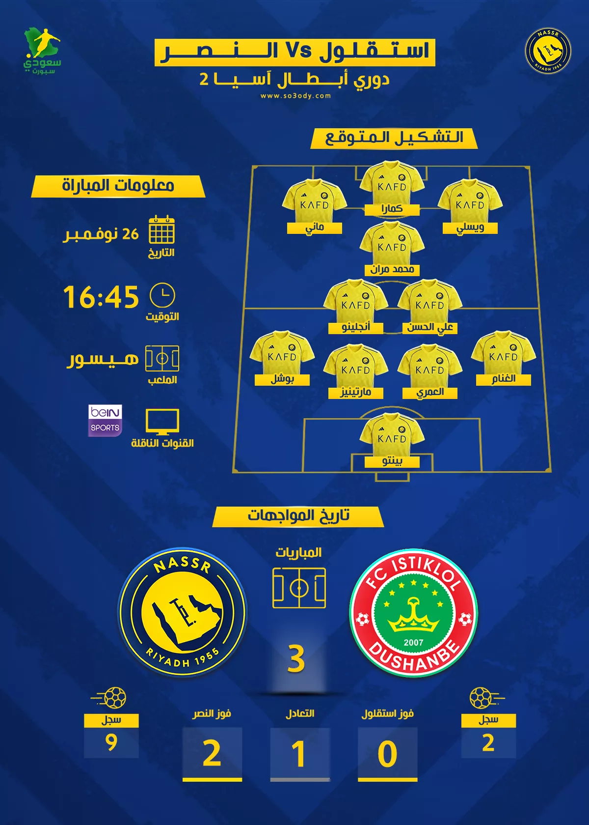 يستعد فريق النصر لمواجهة قارية حينما يواجه فريق استقلال دوشنبه الطاجيكي في دوري أبطال آسيا 2، وذلك تحت قيادة المدرب البرتغالي خورخي خيسوس.