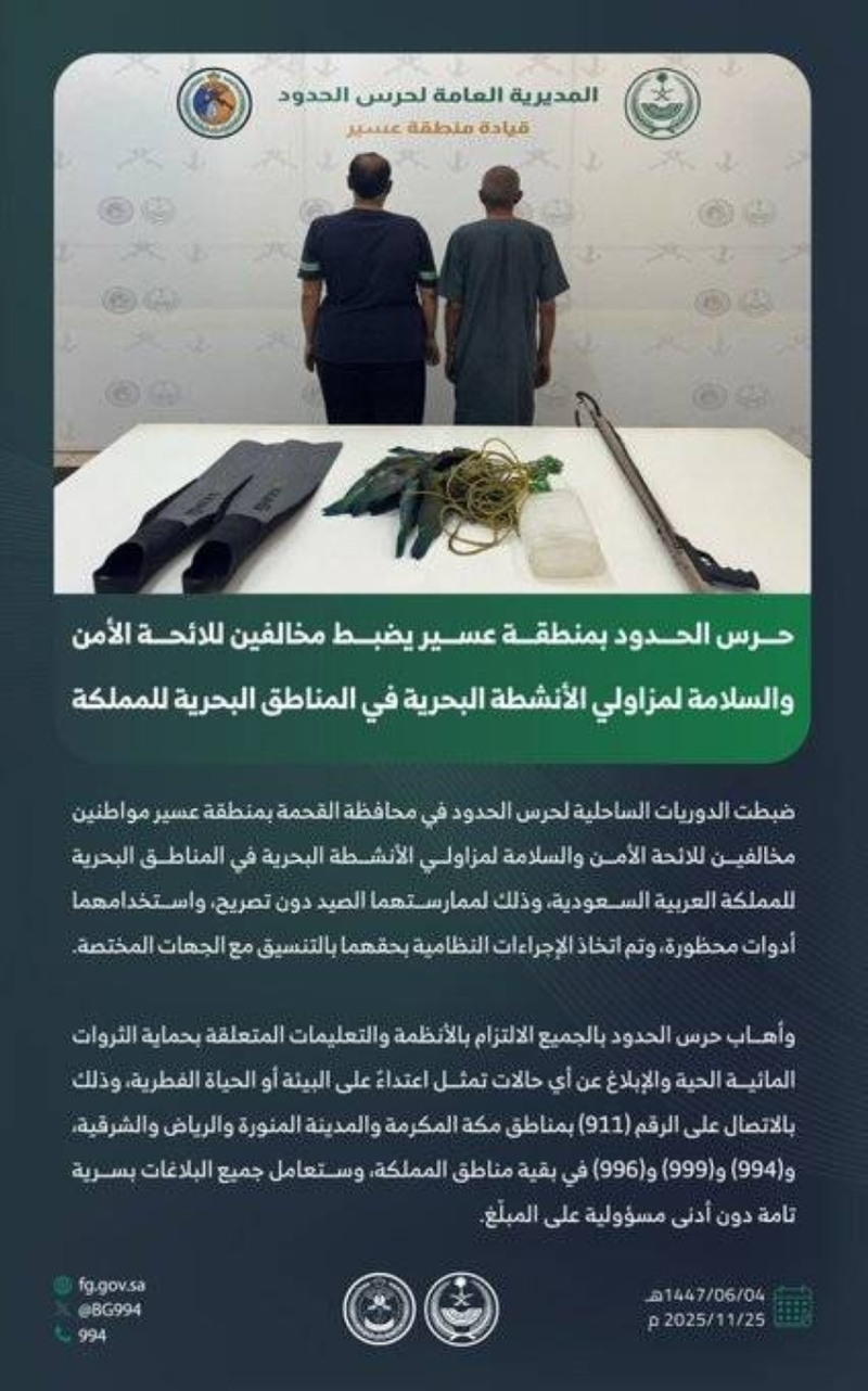 ضبط حراس الحدود في منطقة عسير مخالفين لقوانين الأمن والسلامة للنشاطات البحرية