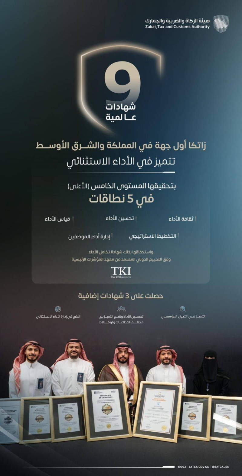 حققت هيئة الزكاة والضريبة والجمارك “زاتكا” إنجازاً كبيراً بالحصول على 9 شهادات عالمية في مجال إدارة الأداء. ومن بين هذه الشهادات، تمثلت إحداها في تكامل الأداء Integrated Performance، حيث تم تقدير الهيئة بالمستوى الخامس (الأعلى) في جميع نطاقات التقييم. وبذلك، أصبحت “زاتكا” أول جهة في المملكة والشرق الأوسط تحصل على هذه الشهادة العالمية المعتمدة من معهد المؤشرات الرئيسية The KPI Institute.
