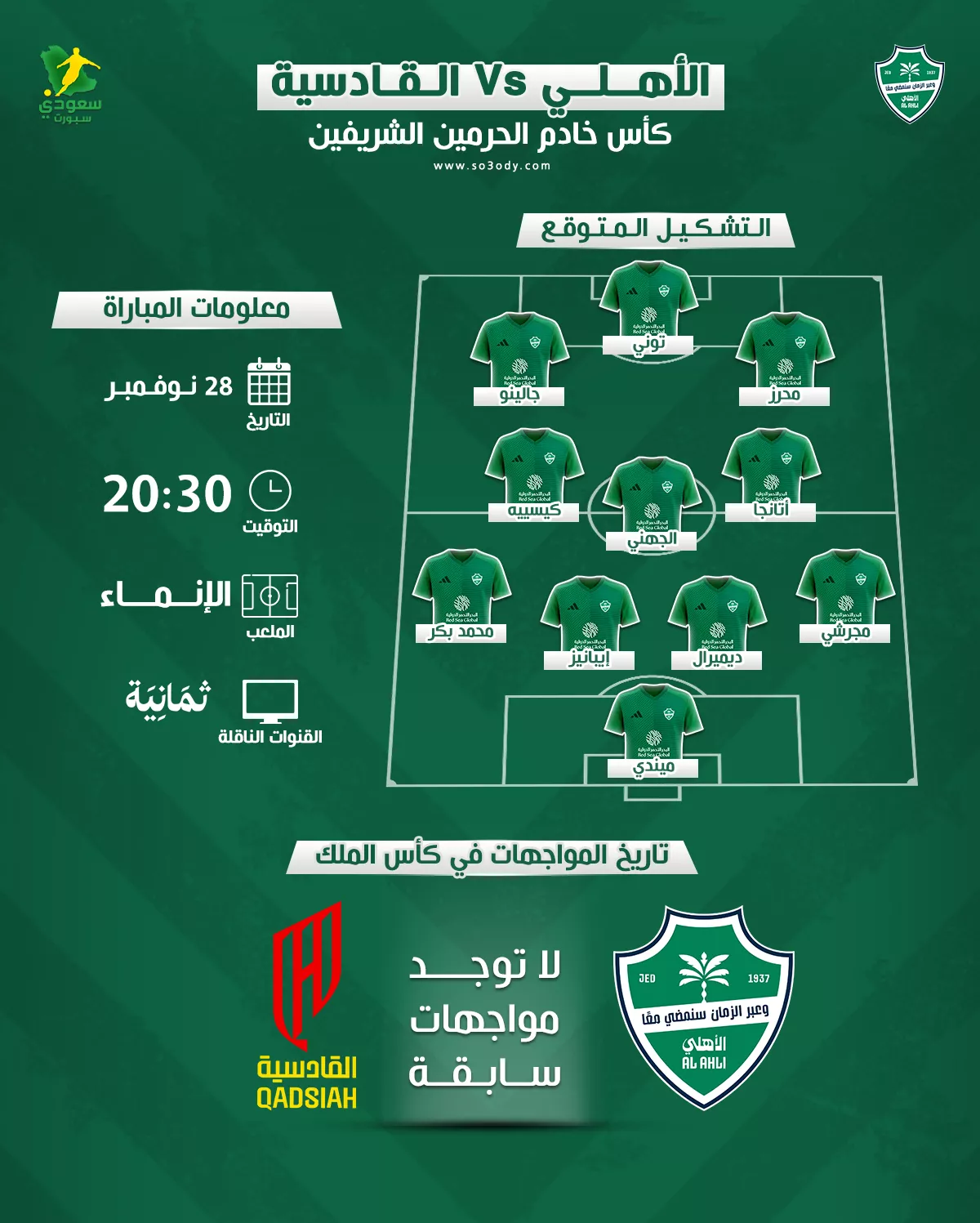 تستعد جماهير كرة القدم لمتابعة مواجهة نارية تجمع بين الأهلي والقادسية ضمن منافسات كأس خادم الحرمين الشريفين. ويشهد اللقاء ترقبًا كبيرًا بين الفريقين، خاصة بعد التحضيرات المكثفة التي خاضها اللاعبون استعدادًا للمباراة.