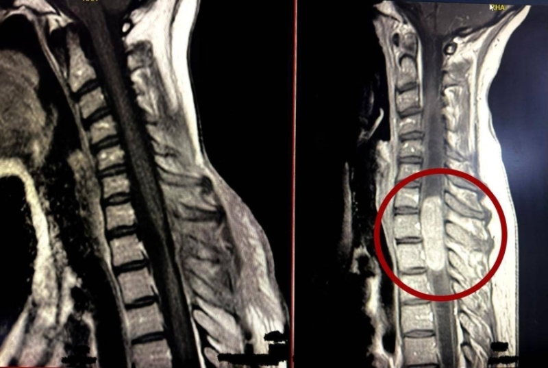 المستفيدة من العملية، والبالغة من العمر 38 عامًا، كانت تعاني من أعراض عصبية متفاقمة استمرت لعدة أشهر، شملت اضطرابات حسية وصعوبة في الحركة. وأظهرت الفحوصات الإشعاعية وجود ورم تسبب في توسعات شديدة داخل القناة المركزية للنخاع الشوكي، مما جعل التدخل الجراحي بالغ الدقة والخطورة.