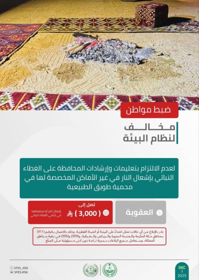 تم ضبط مخالف لنظام البيئة في محمية طويق الطبيعية من قبل القوات الخاصة للأمن البيئي، بسبب إشعال النار في غير الأماكن المخصصة لها. تم اتخاذ الإجراءات النظامية اللازمة ضده، حيث تم تطبيق غرامة تصل إلى 3,000 ريال.