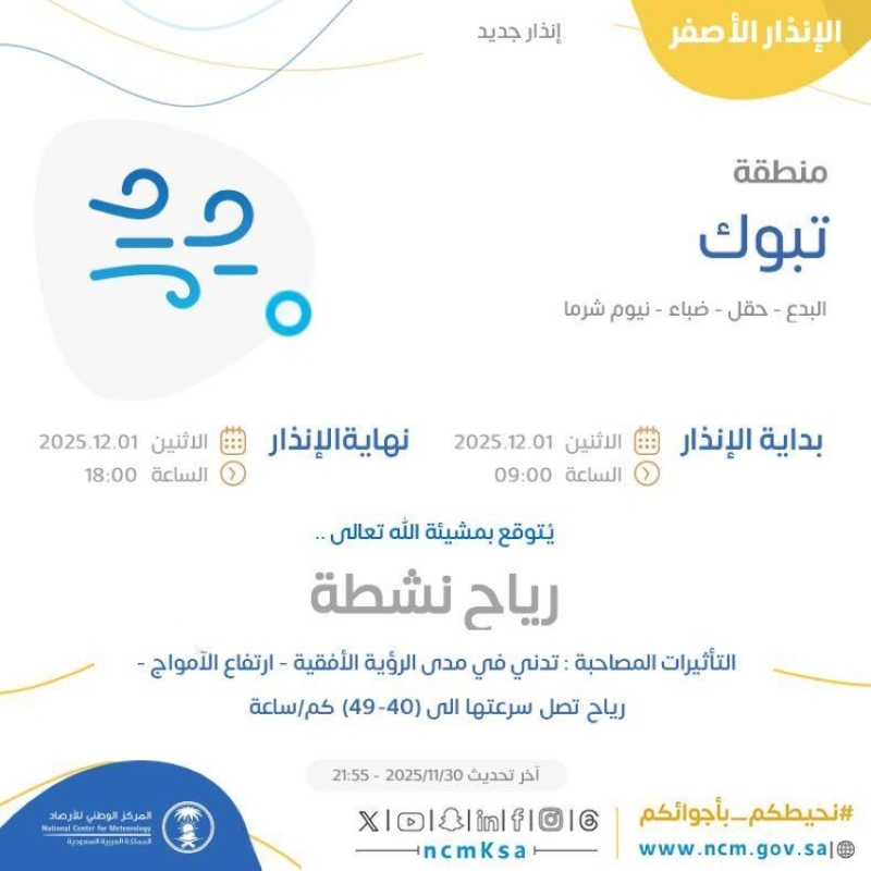 أصدر المركز الوطني للأرصاد الجوية تحذيرًا اليوم بشأن تأثيرات رياح نشطة تجتاح مناطق متفرقة في تبوك. تشمل المناطق المتأثرة البدع، وحقل، وضباء، ونيوم شرما، وأملج، والوجه. من المتوقع أن تتسبب هذه الرياح في تدني مدى الرؤية الأفقية، إضافة إلى ارتفاع الأمواج وسرعة الرياح التي قد تصل إلى 40-49 كم/ساعة.