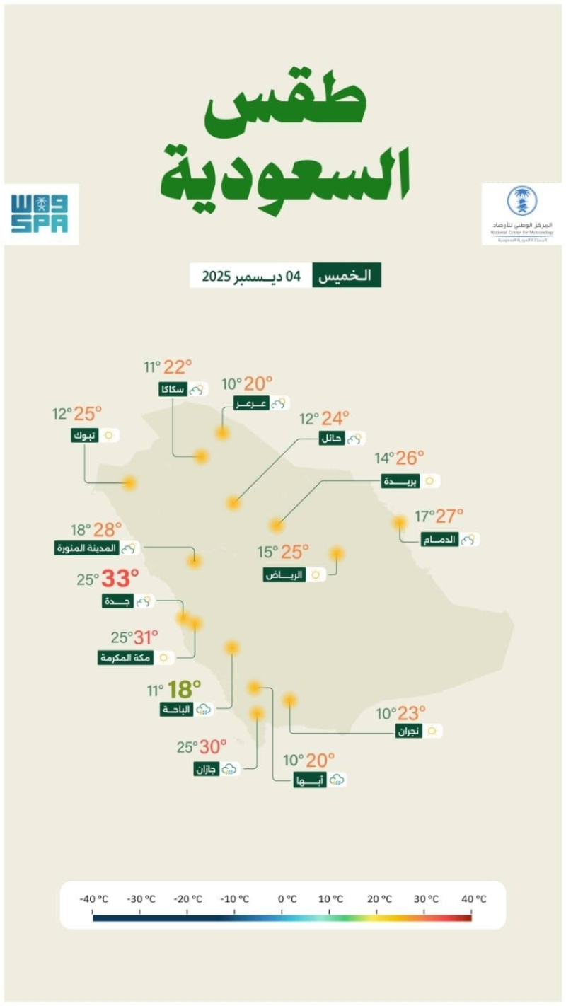 توقعت الأرصاد الجوية في تقريرها اليومي أن تشهد عدة مناطق في المملكة فرصة لهطول أمطار رعدية، مصحوبة برياح نشطة. ومن بين هذه المناطق: عسير، الباحة، مكة المكرمة، المدينة المنورة، حائل، الجوف، الحدود الشمالية. وقد حذرت الأرصاد أيضا من تكون الضباب في تلك المناطق، بالإضافة إلى مناطق الشرقية، الرياض، وجازان.