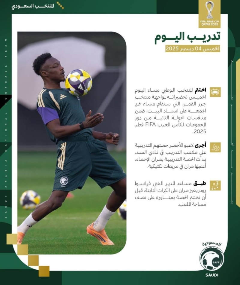 يُذكر أن المنتخب السعودي يأتي في المجموعة الثانية ضمن بطولة كأس العرب FIFA قطر 2025، إلى جانب منتخبات المغرب، وعُمان، وجزر القمر.