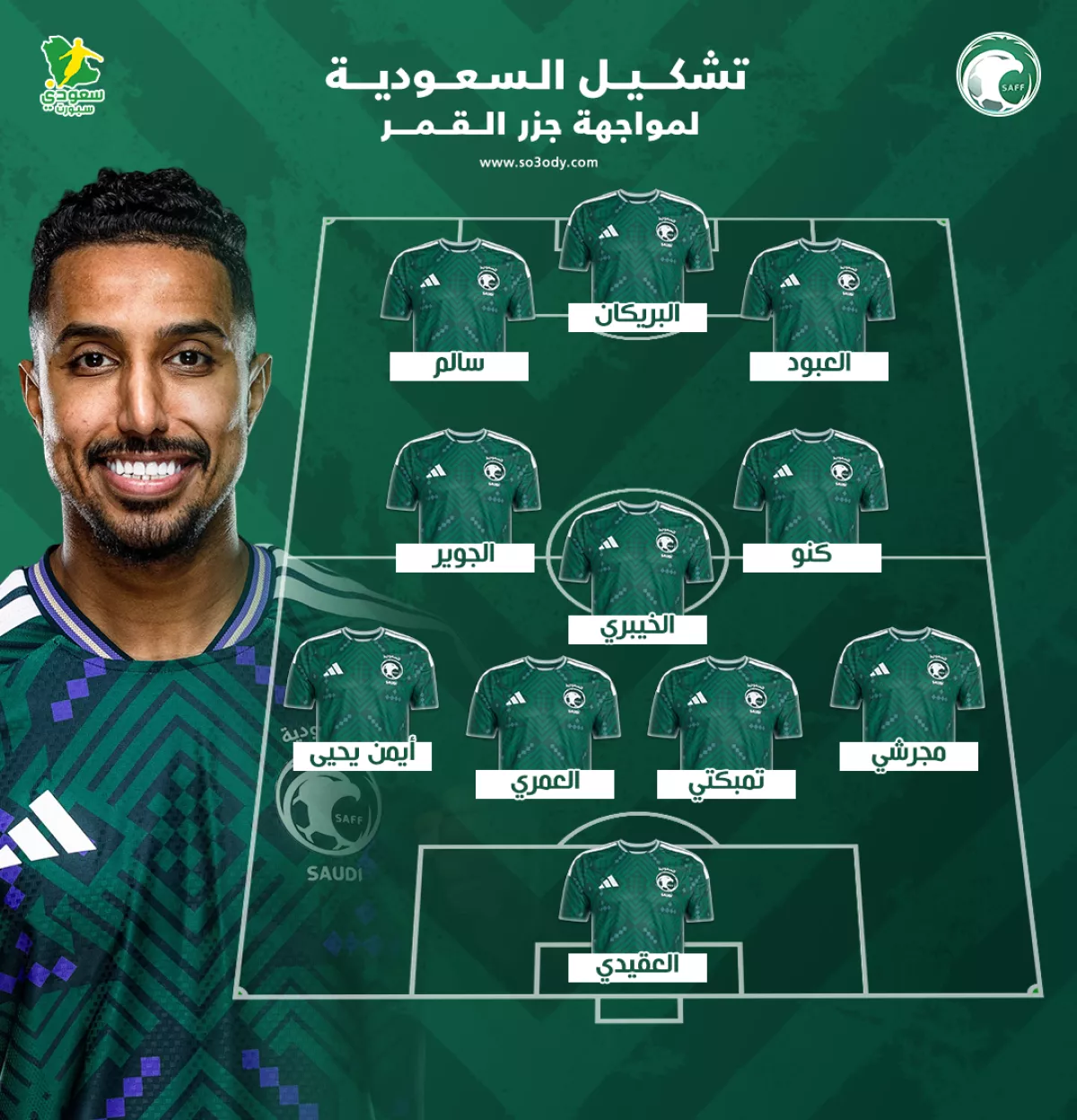 أعلن المنتخب الوطني السعودي لكرة القدم عن تشكيلته الرسمية لمباراته ضد منتخب جزر القمر في بطولة كأس العرب 2025. ويأتي هذا الإعلان قبل انطلاق المباراة التي ستقام اليوم بتوقيت السعودية في إطار الجولة الثانية من دور المجموعات.