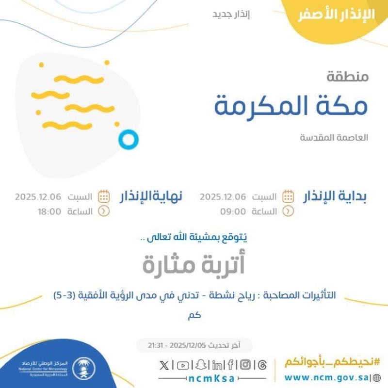 توقع المركز الوطني للأرصاد الجوية تأثير حالة من الأتربة المثارة والرياح النشطة على العاصمة المقدسة. وحذر المركز من تدني مدى الرؤية الأفقية إلى ما بين 3 إلى 5 كيلومترات نتيجة لتلك الظروف الجوية السائدة.