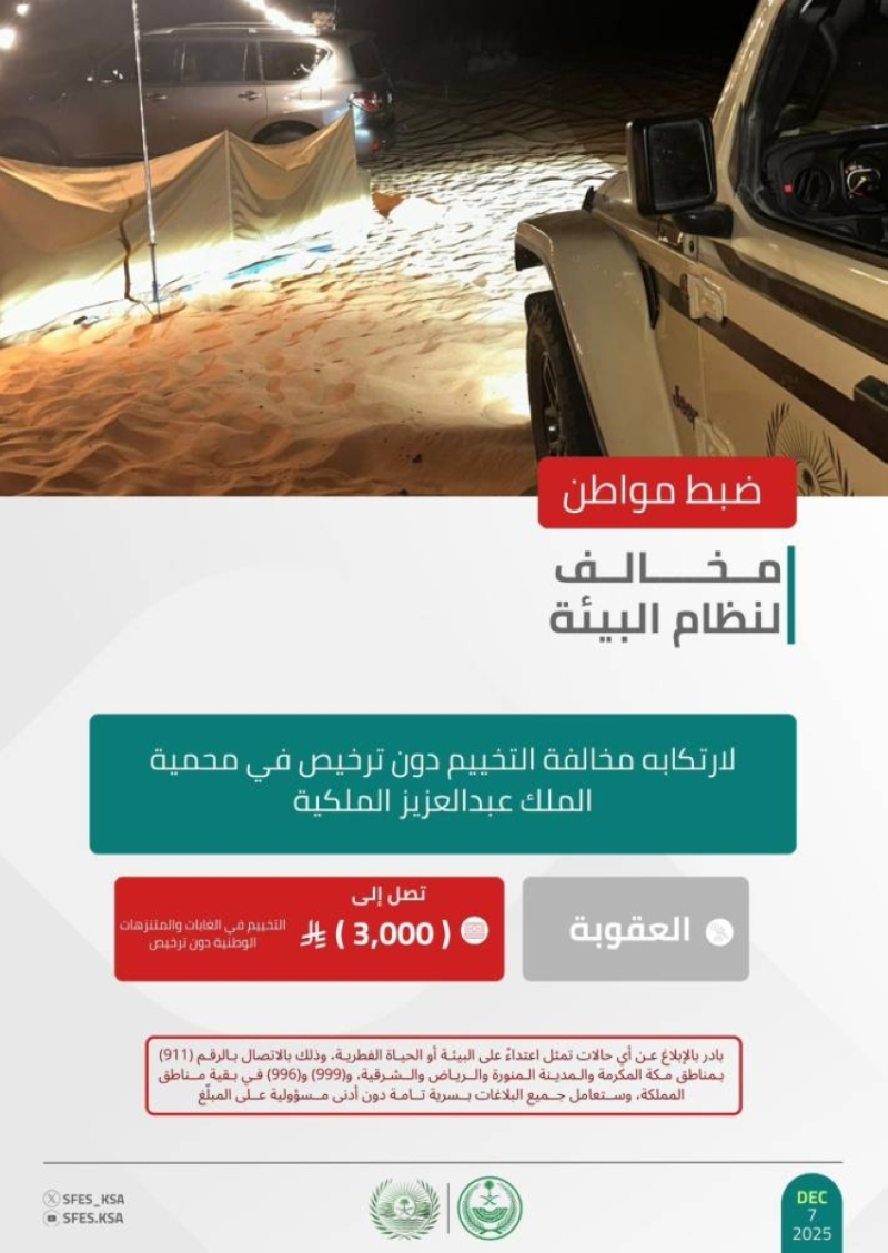وأوضحت القوات أن عقوبة مخالفة التخييم في الغابات أو المتنزهات الوطنية دون ترخيص تصل إلى غرامة تصل إلى 3,000 ريال. وحثت على الإبلاغ عن أي حالات تمثل اعتداءً على البيئة أو الحياة الفطرية على الرقم (911) بمناطق مكة المكرمة والمدينة المنورة والرياض والشرقية، و(999) و(996) في بقية مناطق المملكة. وأكدت أن جميع البلاغات ستعامل بسرية تامة دون أدنى مسؤولية على المبلّغ.