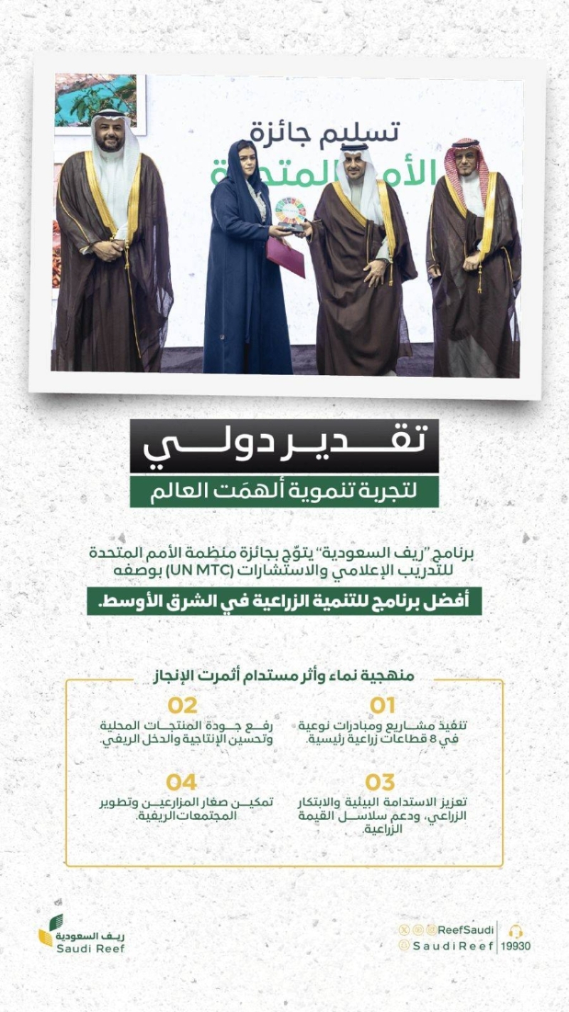 تكريم ريف السعودية بجائزة البرنامج الزراعي الأكبر في الشرق الأوسط من الأمم المتحدة