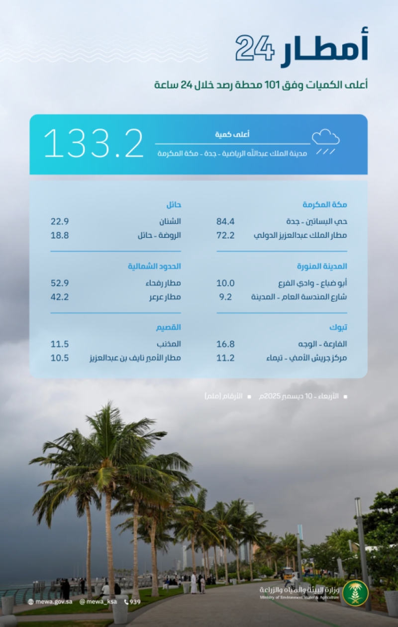 تمتعت منطقة مكة المكرمة بكميات هائلة من الأمطار خلال الفترة الأخيرة، حيث سجّلت مدينة الملك عبد الله الرياضية في جدة أعلى معدل بلغ 133,2 ملم. وليست هذه المدينة الوحيدة التي شهدت هطول الأمطار، بل شملت التساقطات 9 مناطق أخرى في المملكة.