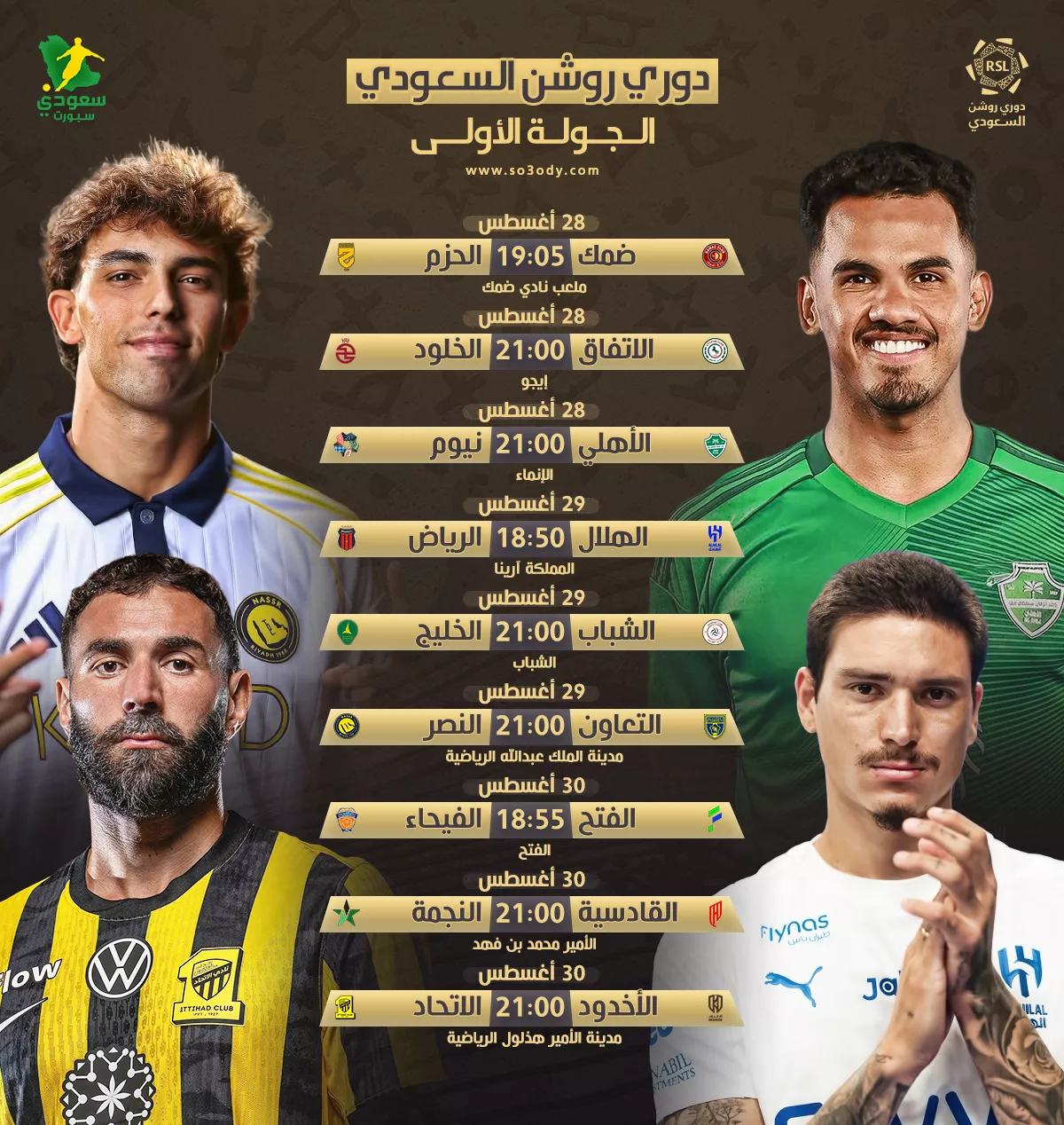 تم الكشف عن مواعيد الجولة الأولى من دوري روشن للمحترفين في الموسم 2025-2026، حيث سيبدأ الموسم في 28 أغسطس الجاري. وستتضمن المباريات الافتتاحية صدام بين الأهلي وبطل يلو، بينما سيبدأ الهلال بديربي الرياض.