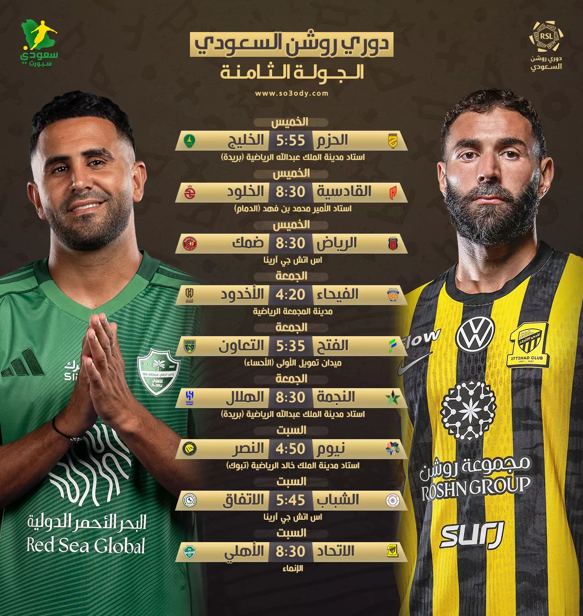 تم الإعلان عن جدول مباريات الجولة الثامنة من دوري روشن السعودي للمحترفين لعام 2025، والتي ستبدأ يوم الخميس الموافق 6 نوفمبر 2025، وتتضمن 3 لقاءات تاريخية ومثيرة.